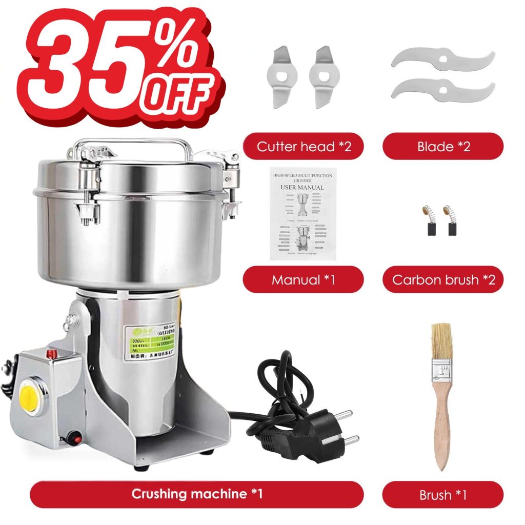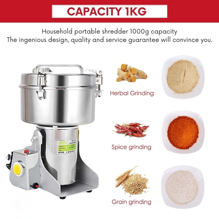 The 1kg capacity grinds everything from peppercorns, sesame, rice, coffee beans, soybeans, dehydrated herbs, to fish feed — perfect for gourmet kitchens and herbalists alike.